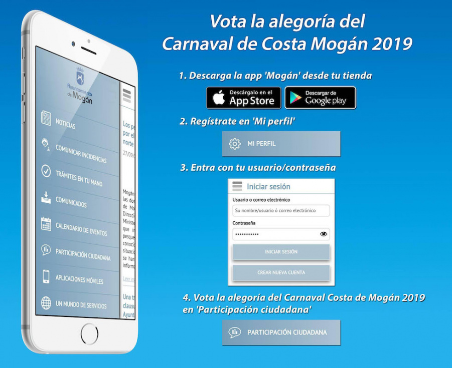 Para participar mediante este método es necesario estar registrado creando una cuenta de usuario. La aplicación está disponible de forma gratuita y se puede encontrar buscando 'Mogán' en la Google Play Store de Android o en App Store de iPhone.