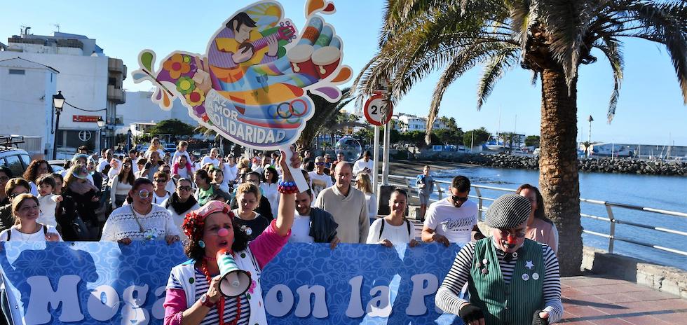 El encuentro reunió a 130 pequeños y pequeñas que junto familiares y educadoras comenzaron la marcha desde la Escuela Infantil de Arguineguín a la plaza Pérez Galdós, lugar en el que se desarrollaron las actividades programadas y que contó con la presencia de Rafaelillo y Antonina, unos 'mensajeros de la paz' que animaron el evento con canciones infantiles populares mientras daban paso a la lectura del Manifiesto por la Paz.