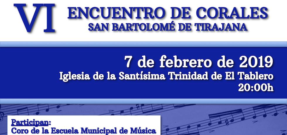 La Iglesia Santísima Trinidad de El Tablero acoge este jueves la celebración del VI Encuentro de Corales del municipio de San Bartolomé de Tirajana, organizado por la Escuela Municipal de Música de este Ayuntamiento.