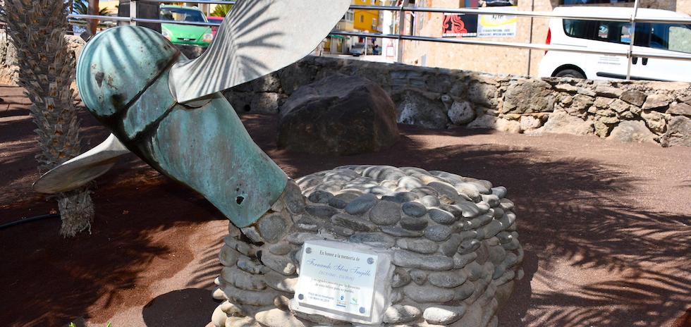 Estas dos hélices que decoran el paseo de la avenida Miguel Marrero Rodríguez, una en cada extremo de la playa de las Marañuelas, lucen ya una placa que agradece a Fernando Silva Trujillo su donación.