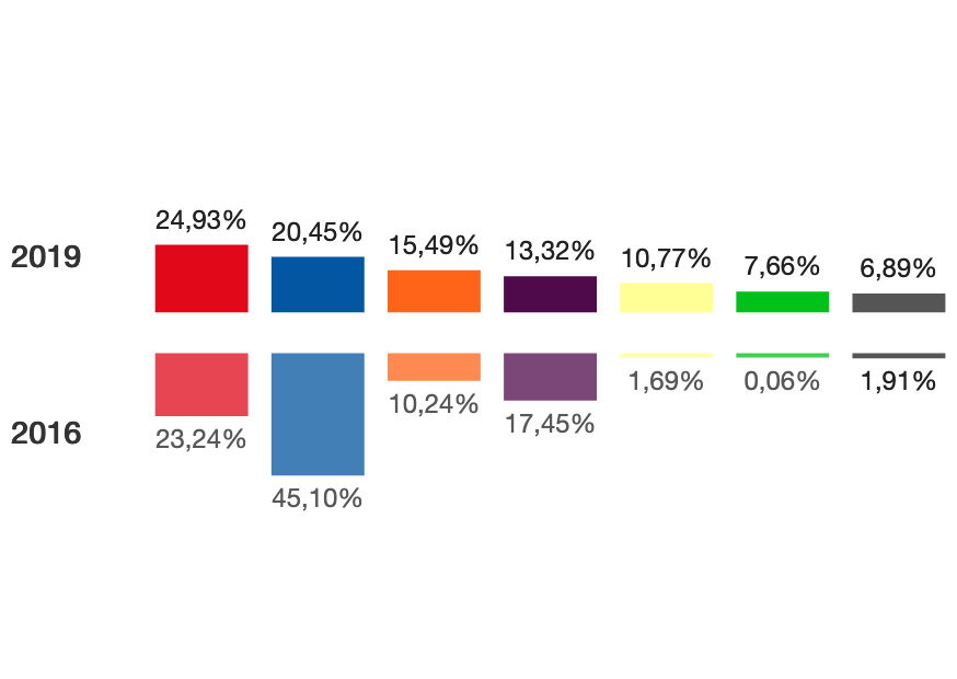 Cs se sitúa en tercera posición con 971 votos y el 15,49% de los votos; Podemos en cuarta posición con 835 votos y 13,32% de los votos y CCa-PNC en quinto lugar con 675 votos y el 10,77% de los votos. Por su parte, Vox ha consiguido en el municipio 480 votos, el 7,66%.