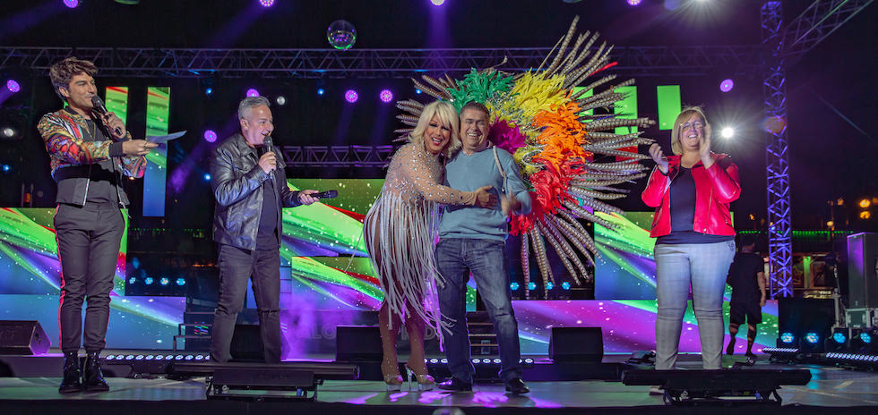La nota musical la pusieron el grupo de baile Lido do Bracil, que inundó el escenario de plumas y color con sus ritmos latinos y la artista italiana afincada en la isla, Gio Box. Y es que el Maspalomas Pride continúa apostando por el talento canario y, por ello, subió al escenario a Rubén Diza, que presentó su nuevo single 'Túmbala' y al duo Divas, que sorprendió con su armónicas y potentes voces.