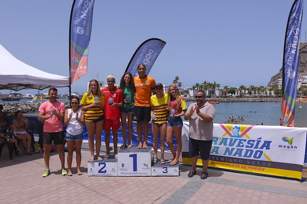 En la categoría femenina, la primera en cruzar llegar a la playa de Mogán fue Carla Chaar del club Aguacan en 15 minutos y 40 segundos. Le siguieron Silvia Blanco (00:17:20) y Judit Padrón de Metropole (00:17:48).