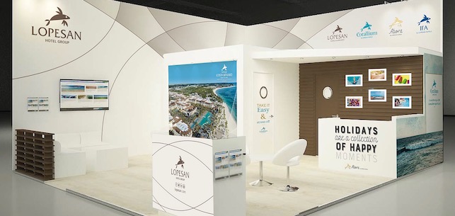 La sencillez y la elegancia vuelven a marcar el diseño del stand de Lopesan, con un mobiliario moderno y funcional que estará acompañado de elementos visuales ubicados estratégicamente para decorar sus paredes. Un espectacular televisor de 60 pulgadas proyectará imágenes que repasarán lo más destacado del portfolio de la compañía, tanto su sensacional oferta alojativa, como los productos vinculados con la gastronomía, el golf o el sector MICE (congresos, viajes de incentivos, conferencias y exposiciones).