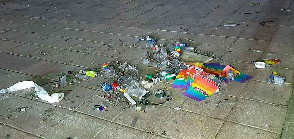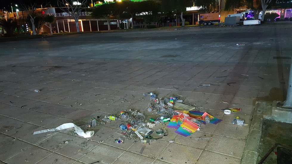 Hace casi una semana que concluyó el Winter Pride, otro de los actos que la comunidad LGTB organiza para reivindicar sus derechos y de paso echarse unas buenas juergas. Lo peor es como amanecen las infraestructuras después de la fiesta. Estas imágenes hablan por sí solas y describen la situación estos días de la plaza pública del centro comercial Yumbo.