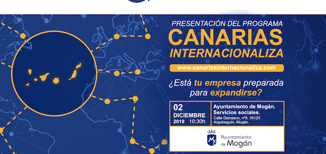 El Ayuntamiento de Mogán, en colaboración con la Cámara de Comercio de Gran Canaria y el resto de Cámaras Canarias, organiza el 2 de diciembre una jornada para pymes con potencial para la exportación en el marco del proyecto 'Canarias Internacionaliza' financiado por el Gobierno de Canarias y el Fondo Europeo de Desarrollo Regional (FEDER).