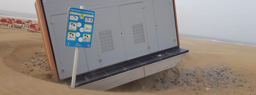 Los nuevos chiringuitos de Maspalomas enterrados por la calima y el viento