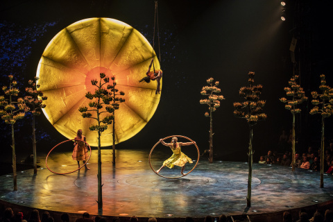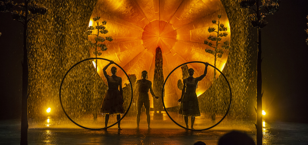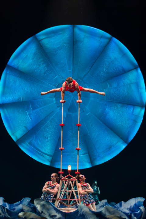 Integrar el elemento del agua agrega un nivel de complejidad acrobática nunca antes visto en la carpa en el Circo del Sol. El agua permitió a los creadores llevar la Roue Cyr fuera de su contexto habitual. Dos artistas que se mueven con el aparato bajo el agua y la lluvia, hazaña que a priori parece impensable.