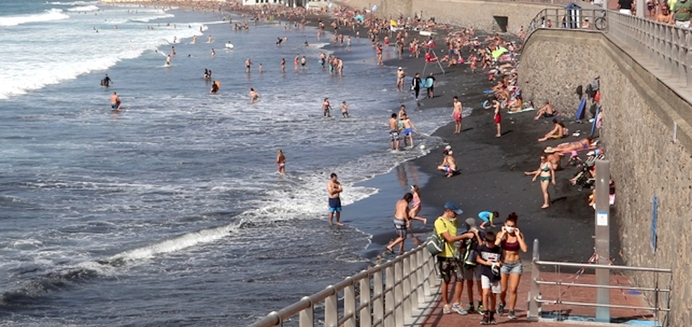 El aparato, que ha sobrevolado la playa de Las Canteras y la Laja, permite a la Policía Local localizar desde el aire las aglomeraciones e identificar puntos calientes donde no se estén cumpliendo con las medidas establecidas.