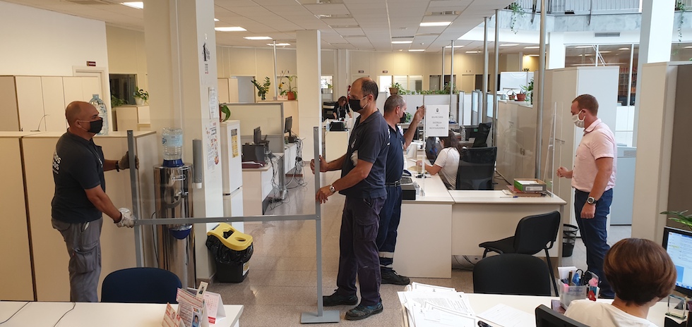 En mañana de este jueves han seguido instalando nuevas mamparas en las oficinas municipales. Unos se colocan agarradas a la misma mesa de los trabajadores, y otras vienen con unas patas metálicas.