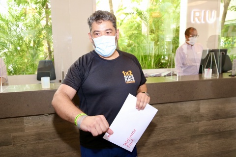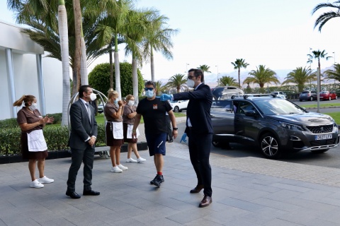 El primer cliente en entrar en el RIU Gran Canaria ha sido Juan Antonio González, de Telde, que ha sido recibido por todo el equipo del hotel en la recepción.