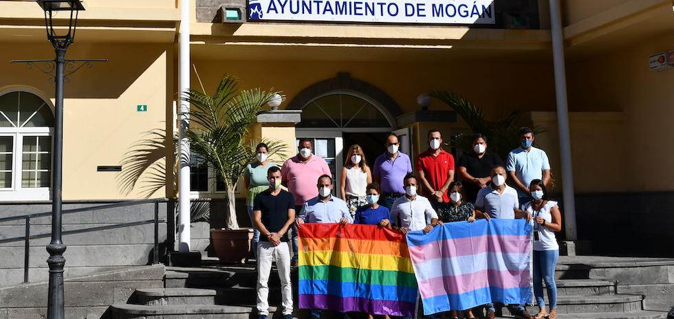 La alcaldesa de Mogán, Onalia Bueno, los concejales del Grupo de Gobierno local (CIUCA), los del Partido Popular y PSOE se han congregado en la entrada del edificio municipal del casco de Mogán donde, portando las banderas, la concejala de Servicios Sociales, Tania Alonso, ha leído un manifiesto en apoyo a las reivindicaciones del  colectivo LGTBI.