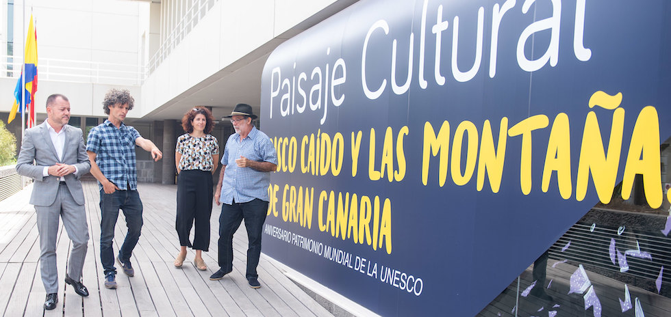 La fachada del Cabildo de Gran Canaria luce un mural dedicado a Risco Caído y las Montañas Sagradas de Gran Canaria con motivo de su primer año como Patrimonio Mundial, un trabajo artístico cuyo objetivo era transformar la vidriera en una cueva.