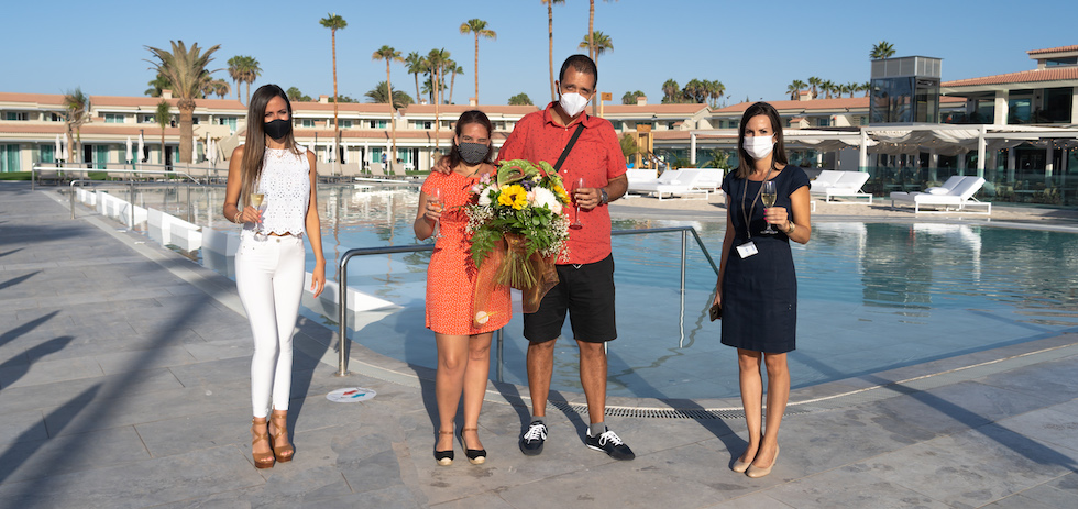 Patricia Martín y Octavio Trujillo eligieron el Kumara Serenoa porque quería disfrutar del estreno de la nueva propuesta del Grupo Lopesan, lo que nunca imaginó esta pareja de Las Palmas de Gran Canaria, cuando realizó la reserva hace meses, es que se iban a convertir en los primeros huéspedes de la historia del complejo. Elena Martel, directora del Kumara Serenoa by Lopesan Hotels, y Sabrina Ojeda, subdirectora del hotel, fueron las encargadas de darles la bienvenida en nombre de todo el equipo y recibirles con un precioso ramo de flores.