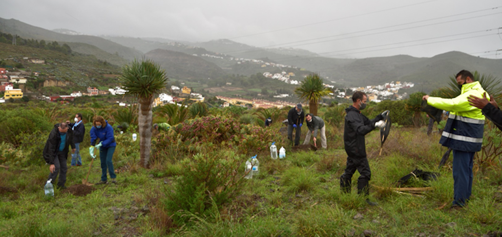 Veintiún socios en representación de los veintiún municipios de Gran Canaria fueron los encargados de plantar árboles en ladera de la antigua presa de Martinón, en el barrio del Zardo.
