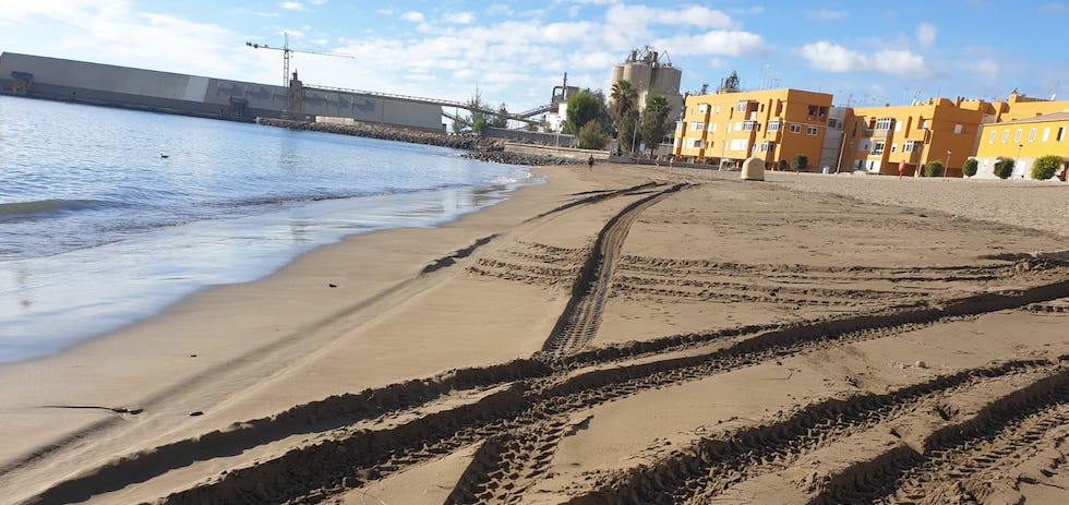 La subida de la marea ya sobrepasa el vistoso contenedor situado en plena playa de El Pajar esparciendo los líquidos de las basuras, a la vez que el camión para su vaciado se adentra en la playa con el impacto medioambiental que ello supone.