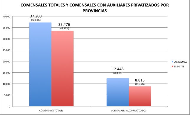 Del global que tienen a los auxiliares privatizados, el 58,54% (12.448 comensales) corresponden a las orientales frente al 41,46% (8.815) a las occidentales. En Las Palmas hay 98 centros con auxiliares privatizados; en Santa Cruz de Tenerife, 73.