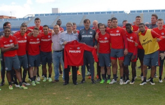 En el Estadio Municipal de Maspalomas, alcalde de San Bartolomé de Tirajana y edil de Deportes también visitaron al plantel del PSV. Marco Aurelio Pérez departió en una amistosa charla con Phillipe Cocu y con el jugador mexicano Andrés Guardado, que coincidió en el Deportivo con Juan Carlos Valerón y en el Valencia con Jonathan Viera. Guardado deseó “éxito a ambos” lo que seguramente “derivará en el ascenso de Las Palmas, que ya lo merece”.