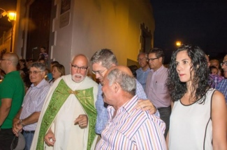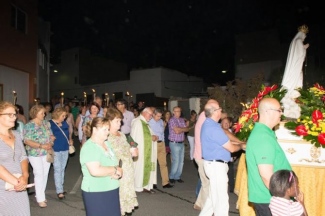 Con la iglesia a rebosar, un grupo rociero de Las Palmas de Gran Canaria se encargó de cantar los pasajes de la Misa ante varios centenares de fieles veneradores de la imagen de la patrona de Aldea Blanca. La afluencia aumentó con los incorporados al posterior recorrido de la imagen de la Virgen de Fátima por las calles, mientras los fervorosos acompañantes portaban antorchas en torno a la talla de la patrona.
