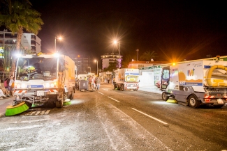 El dispositivo de limpieza postcarnaval proseguirá actuando hasta el próximo sábado con acciones de repaso y recuperación de los puntos de mayor concurrencia de Playa del Inglés, Maspalomas y San Fernando, donde se están efectuando barridos intensivos y baldeos en profundidad en los que se utilizarán unos 180.000 litros más de agua.