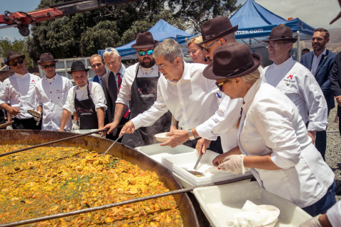 Un ejército de 30 chefs, diez más que el año pasado, se enfrentaron a la tarea de confeccionar la gran paella siguiendo las rigurosas pautas que fue indicándoles paso a paso el fundador y presidente honorífico de Mojo Picón, Benito Benítez, que también contó en esta ocasión con el trabajo colaborador de una quincena de estudiantes de cocina y restauración de los institutos de Formación Profesional Faro de Maspalomas y Arinaga.