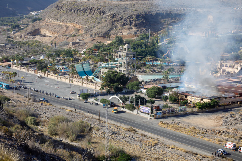La parcela donde se albergaban las antiguas instalaciones de la Perla Canaria, en la carretera dirección a Ayagaures, junto al centro de ocio Aqualand Maspalomas, ha comenzado a arder en torno a las 17:30 de este lunes. El impresionante incendio ha generado una gran columna de humo que ha causado la gran expectación de turistas y residentes. El fuego ha originado grandes daños materiales como la quema de varios vehículos y una persona ha sido atendida por el SUC con quemaduras en una pierna.