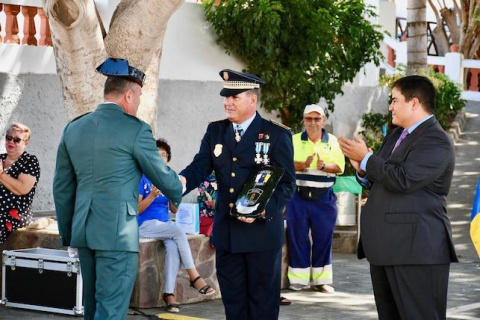 Después del acto religioso dio comienzo en la plaza de este barrio moganero la entrega de distinciones por parte del acalde accidental, Mencey Navarro, y el subinspector jefe de la Policía Local de Mogán, Jorge Alemán. Así, en representación de sus respectivos Cuerpos, los reconocimientos por la constante cooperación en materia de seguridad ciudadana en el municipio fueron recibidos por el jefe de la Comisaría de la Policía Nacional de Maspalomas, Eduardo Manuel García, el teniente de la Guardia Civil de Mogán, Juan Manuel Rodríguez, y el jefe de la Agrupación de Voluntarios de Protección Civil de Mogán, Wensceslao Hernández.