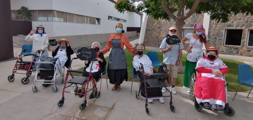 Por su parte, los usuarios del Centro de Día de Alzheimer y otras demencias comenzaron la mañana con la elaboración de platos típicos canarios como la pella de gofio o el mojo rojo. La salida diaria al jardín estuvo amenizada con música canaria y, para inmortalizar el momento, se realizaron una sesión de fotos con el personal del centro en un Foto Collage que los propios usuarios han realizado.