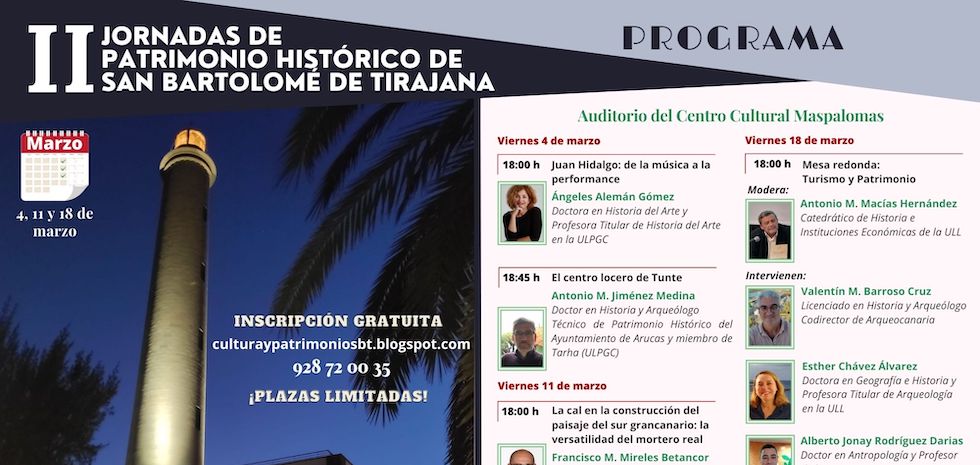 La Concejalía de Cultura y Patrimonio Histórico ha organizado las II Jornadas de Patrimonio Histórico de San Bartolomé de Tirajana, cuyo objetivo fundamental es dar a conocer y poner en valor el Patrimonio Histórico de Canarias, lo cual facilita y fomenta la comprensión de la identidad cultural de las islas.
