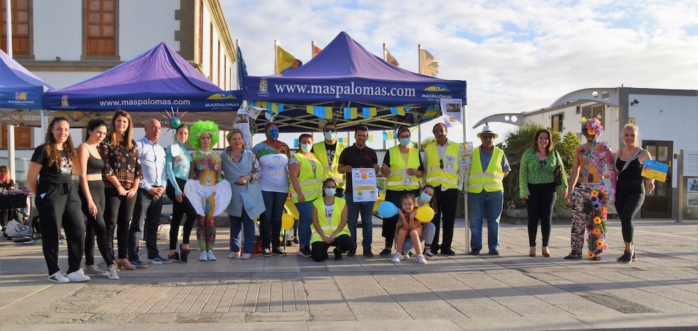 Voluntarios de la Asociación Karuna Maspalomas han realizado este domingo una exhibición de bodypainting en la explanada del Faro de Maspalomas para recaudar donativos para Ucrania.
