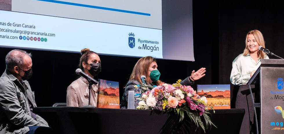 En la tarde de ayer, jueves 31 de marzo, la escritora Alicia Llanera y el fotógrafo Nacho González mantuvieron un encuentro con los vecinos y vecinas de Mogán para hablar de su trabajo en el proyecto y libro 'Una isla contada. Antología para recorrer Gran Canaria', que impulsa la Biblioteca Insular. Este acto, celebrado en el Centro Cultural El Mocán, contó con la presencia de la alcaldesa de Mogán, Onalia Bueno, y de la consejera de Cultura del Cabildo de Gran Canaria, Guacimara Medina.