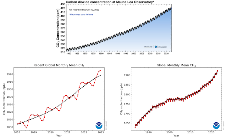 Arriba: evolución de la concentración atmosférica de dióxido de carbono, medida por la Institución Scripps de Oceanografía de la Universidad de California en San Diego. Abajo: evolución de la concentración atmosférica de metano, medida por la NOAA.
