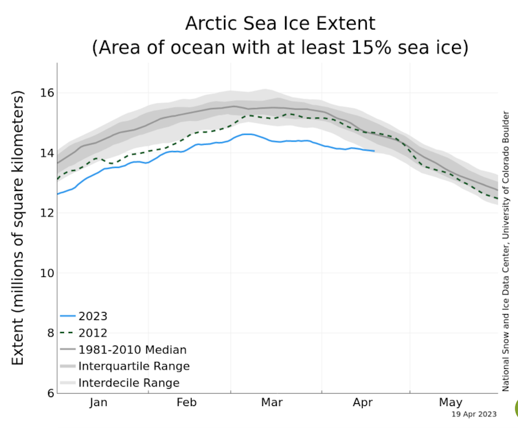 Extensión del hielo ártico, actualmente mucho menor que sus variaciones entre 1981 y 2010. Es decir, estamos más cerca de una situación de verano que de primavera en marzo y abril. National Snow and Data Ice Center / University of Colorado, Boulder