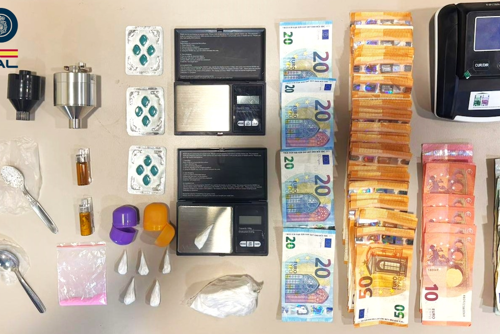 El operativo se desarrolló en el barrio de San Juan con dos entradas y registros en domicilios, donde se intervinieron 60 gramos de cocaína, seis monodosis, 1,5 gramos de cocaína rosa “Tusi”, 12 pastillas de viagra, dos básculas digitales, un detector de billetes falsos, materiales para elaboración y distribución de droga y 5.075 euros en efectivo.