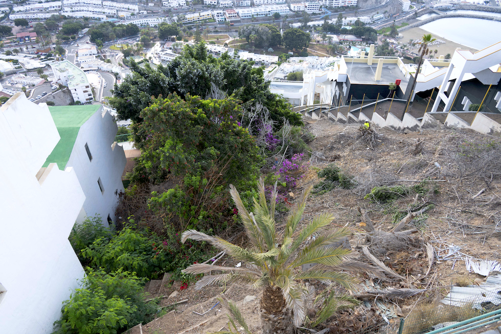 El Ayuntamiento de Mogán ha iniciado una intervención de limpieza y desbroce en una ladera de difícil acceso en la zona alta de Puerto Rico, donde durante años la vegetación había crecido sin control.