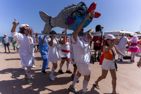 La tradicional Sardina del Carnaval de Maspalomas fue rescatada este viernes en la playa, una celebración que este año rindió homenaje a Cristóbal Rodríguez.