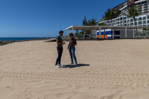 La Playa del Cura, Mogán, encara la fase final de mejoras con la colocación de 750 toneladas de arena en el entorno del nuevo módulo de restauración y salvamento, ubicados sobre una plataforma peatonal de madera. La alcaldesa Onalia Bueno, junto a varios concejales del grupo de gobierno, visitó este viernes la zona para supervisar los avances.