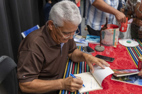 MASPALOMAS AHORACon motivo de la programación municipal por el Día de las Bibliotecas, Román Moreno Afonso, conocido como "el poeta de las comandas" y residente en el barrio de El Horno, presentó ayer jueves su cuarta obra, Aromas de Nuestra Tierra. El acto, que se llevó a cabo en el Centro Polivalente de Arguineguín, reunió a vecinos, familiares y representantes del Ayuntamiento de Mogán, entre ellos el concejal de Bibliotecas, Neftalí Sabina.