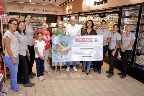 El equipo de las tiendas del grupo Pérez Bolaños, asociadas a SPAR Gran Canaria y participantes en esta campaña solidaria, entregaron en SPAR La Paloma el talón por valor de 1.500 euros a los representantes de Cáritas Agüimes, que estuvieron acompañados también por el alcalde del municipio, Óscar Hernández, y la concejala de bienestar social e igualdad, Eva López.