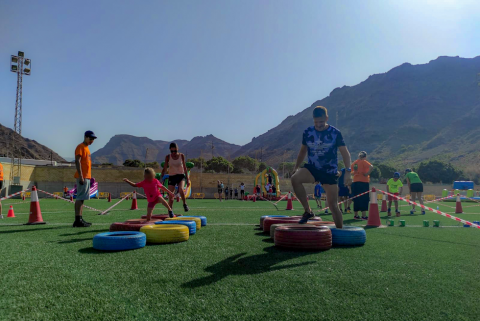 El Campo Municipal de Fútbol de Mogán por tercer año consecutivo ha acogido el vento Family Jumping, una actividad lúdico-deportiva familiar donde han participado más de 220 parejas, (formada por padres e hijos), en un circuito de 2 kilómetros con obstáculos hinchables, algunos acuáticos, entre otros.