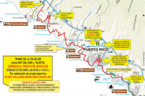 El acceso de vehículos a Anfi del Mar y Los Caideros estará cerrado debido a la zona de transición de la prueba de bicicleta. Se permitirá acceso restringido controlado por agentes de tráfico. Los peatones deben desplazarse por zonas señalizadas, con una parada provisional para el transporte público de viajeros.
