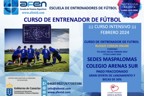 La Escuela de Entrenadores de Fútbol AFEN y el Colegio Arenas Sur anuncian el reinicio del curso intensivo que comenzará en febrero en la sede del colegio privado de San Agustín. El primer paso se dará el 20 de febrero en el campo de fútbol de Las Burras, con las pruebas de acceso a la formación de Grado de Entrenador de Fútbol. El itinerario académico de formación profesional ofrece ventajas y becas para el alumnado de los colegios Arenas Sur y Arenas Almas que estén realizando simultáneamente estudios de Bachillerato.