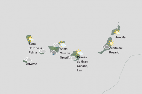 Probables lluvias débiles y ocasionales, principalmente en zonas de interior y vertientes este por la tarde, cuando no se descarta que puedan ser localmente moderadas y en forma de chubasco, poco probables en Lanzarote y Fuerteventura.