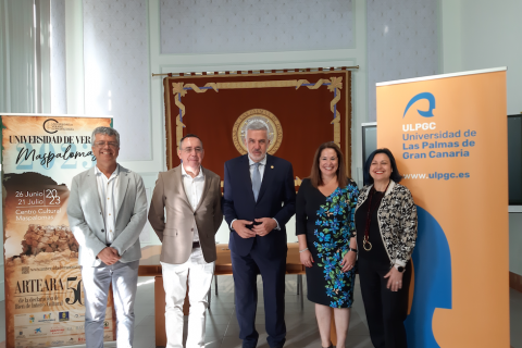 Así lo anunció el vicepresidente de la Academia de las Artes Escénicas de España, Eduardo Galán Font, en el encuentro que mantuvo con el Rector de la ULPGC, Lluís Serra Majem; la concejala de Cultura y Patrimonio Histórico de San Bartolomé de Tirajana, Elena Espino Santana; el director de la Universidad de Verano de Maspalomas, Germán Santana, y Carmen Márquez, profesora de Filología de la ULPGC y miembro de la junta directiva de la Academia de las Artes Escénicas.
