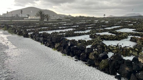 La granizada ha alcanzado a otras zonas de la isla, como La Geria, donde sepultó los viñedos, o a localidades como Mazdache, Tinajo, Teguise y Arrieta, entre otras.