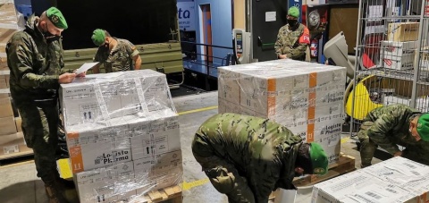 El Ejercito de Tierra ha sido el que ha recogido las vacunas en Leganés y las ha trasladado a la Base Aérea de Getafe, y desde allí miembros del Ejército del Aire las han trasladado a las Islas Canarias.