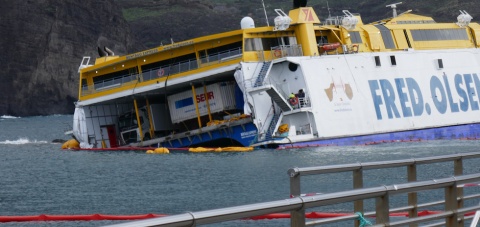 El ferry "Bentago Express" de la naviera Fred Olsen, encallado junto al muelle de Agaete (Gran Canaria), "no tiene ningún tipo de riesgo de hundimiento" ni tampoco de provocar contaminación ambiental, según han asegurado este lunes los responsables del dispositivo organizado para rescatar el buque.