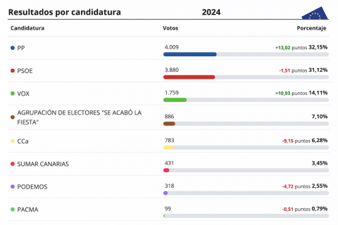 El PSOE pierde 1,5 puntos con respecto a sus resultados en las europeas de 2019, el PP gana casi 13,5 puntos, Vox sube 8,7 puntos y CC pierde más de 10 [...] Leer más...