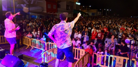 La fiesta comenzó con la actuación del dúo de humoristas Víctor Hubara y Nacho Peña, que representaron su espectáculo ‘Noches de Fantasía’, donde combinan música y humor. El espectáculo de los cómicos canarios nació durante el confinamiento, cuando Hubara y Peña aprovecharon que la gente no podía salir de casa para repartir alegrías a través de las redes sociales recordando los mejores momentos de las verbenas canarias. Las risas y la nostalgia recordando las canciones de los noventa y los sonidos verbeneros más clásicos alegraron la noche al respetable.