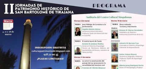 La Concejalía de Cultura y Patrimonio Histórico ha organizado las II Jornadas de Patrimonio Histórico de San Bartolomé de Tirajana, cuyo objetivo fundamental es dar a conocer y poner en valor el Patrimonio Histórico de Canarias, lo cual facilita y fomenta la comprensión de la identidad cultural de las islas.